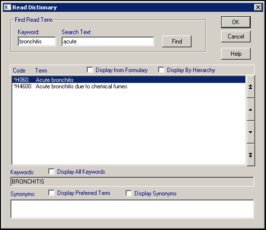 Once the Read Dictionary entry screen displays, enter a keyword in Keyword, for example, 'bronchitis' and, if required a Search Text and select Find to display a list of matching clinical terms.