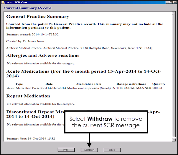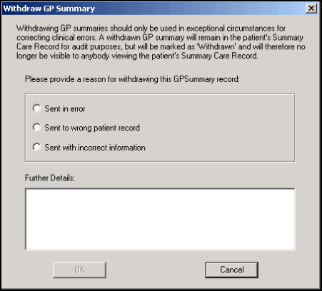 - Select Withdraw, the 'Withdrawing GP summaries should only be used in exceptional circumstances for correcting clinical errors. A withdrawn GP summary will remain in the patient's Summary Care Record for audit purposes, but will be marked as `Withdrawn' and will therefore no longer be visible to anybody viewing the patient's Summary Care Record. Please provide a reason for withdrawing this GP Summary record:' screen displays: