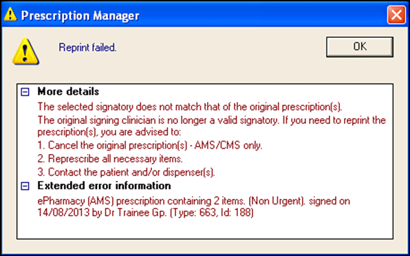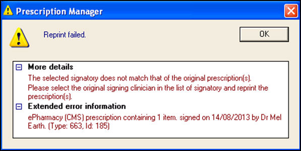 When reprinting an Acute Medication Service (AMS) or Chronic Medication Service (CMS) prescription, you cannot reprint the prescription if the selected prescriber in Prescription Manager differs from the original signer of the prescription. Where this happens, the 'The selected signatory does not match that of the original prescription(s). Please select the original signing clinician in the list of signatory and reprint the prescription(s). ePharmacy (AMS/CMS) prescription containing n item signed on nn/nn/nnnn by "prescriber name' displays: