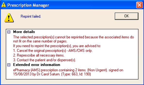 If the number of pages differs from the original prescription, the prescription is not reprinted and the 'The selected prescription(s) cannot be reprinted because the associated items do not fit on the same number of pages.' message displays:
