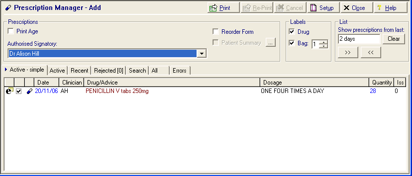 - The Prescription Manager screen displays, any acute medications added today are selected by default. Select Print