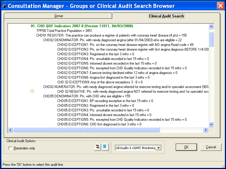 - Find the audit line you want in exactly the same way as you would in Clinical Audit. Select a main blue line Audit Group (for example, QMAS Returns and Monitoring Audits) to expand the red clinical area lines beneath (for example, QMAS Returns - Clinical 2019-20). Select a red line to expand the clinical categories beneath, which are green headings (for example, CHD QMAS indicators). Select the required audit line, coloured black, to select it. Then select OK.