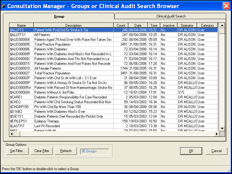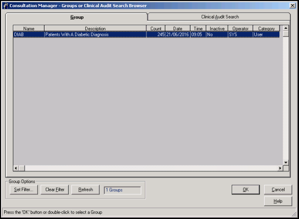 From Consultation Manager, you can select a Patient Group that has been created by a Search, with a group output or a Clinical Audit. This enables you to run through the group of patients, checking and applying any actions required without having to search for each patient.