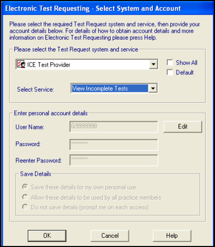- Select Add - Requests - Electronic Requests and the Electronic Test Requesting - Select System and Account screen displays: