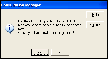 On adding the items, you are prompted, with “<drug name> is recommended to be prescribed in the generic form. Would you like to switch to the generic?” You can either select Yes to continue to prescribe the generic or no to cancel and return to the Therapy Add form.