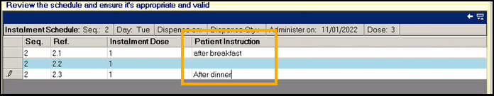 The dose details for the day selected display. In the Patient Instruction column enter the dose plan instructions, for example, After meals: