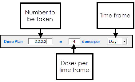 Dose Plan - Populates from the dosage set on the Therapy - Add screen but can be updated. You can detail the way the medication should be taken. Doses are separated by a comma, for example, 2,2,2,2 indicates take two four times a day, 1,2,1,2 indicates the first dose of the day is one, the second is two, the third is one and the final is two. Enter the dose plan, number of doses per time frame and select the time frame as required. Updating the Dose Plan, automatically updates Treat Days:
