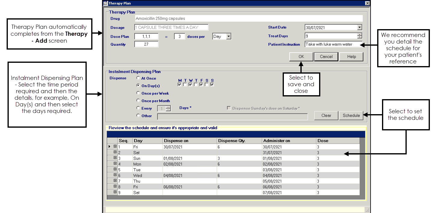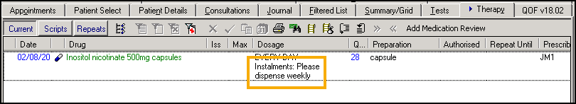 The Therapy Plan screen enables you to set up and manage an Instalment Dispensing Plan for an item you are prescribing.