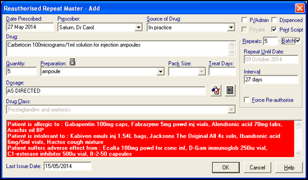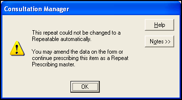 If a Repeat is not initially compatible, for example, private medication, a warning displays, 'This repeat could not be changed to a Repeatable automatically. You may amend the data on the form or continue prescribing this item as a Repeat Prescribing Master':