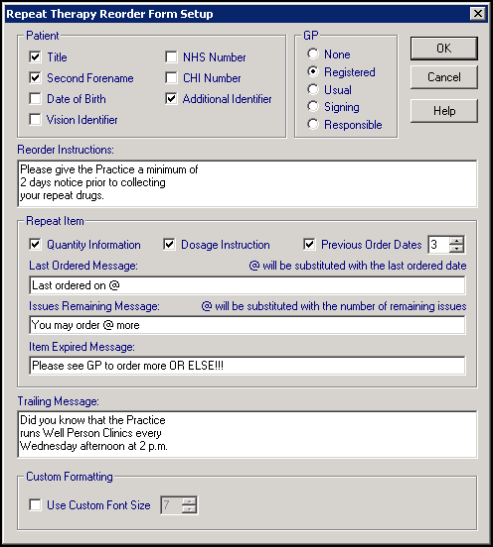 - Custom Formating - Tick to change the font size on the printed form.Note - Scotland only - You must print prescriptions in Courier 11 font, which can be read by the scanners at the pricing bureau, see Printer Profiles for details.