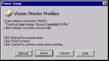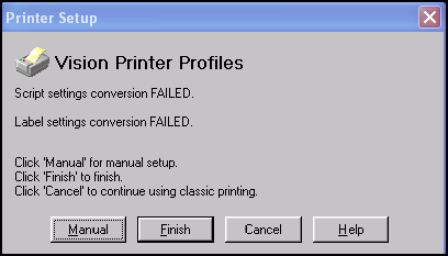 - Finish - To exit the screen without Printer Profiles being set up for either Script or Label settings, whichever failed.
