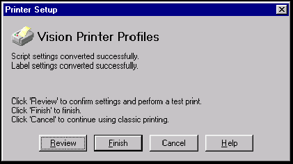 If Vision detects that no profiles have been created for this workstation and there is at least one printer set up for classic printing, then the conversion process is triggered:
