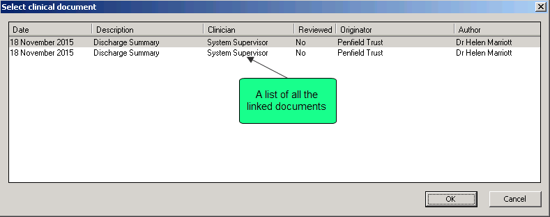 - If there is only one document linked to a record, Document Viewer displays. If more than one document is linked to a record, Select clinical document displays, either double click on the document you wish to view, or highlight the entry required and select OK.