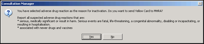 - The 'You have selected adverse drug reaction as the reason for inactivation. Do you want to send Yellow Card to MHRA?' message displays, select Yes: