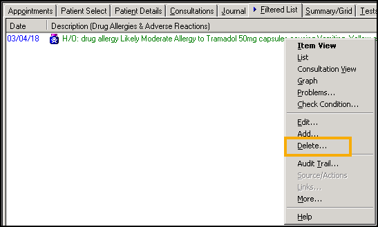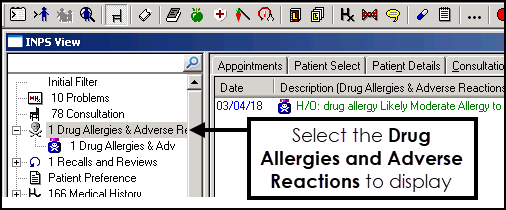 - From Consultation Manager, find the saved Drug Allergy and Intolerance entry which contains the Yellow Card information. You can select the Drug Allergies & Adverse Reactions category in the navigation pane: