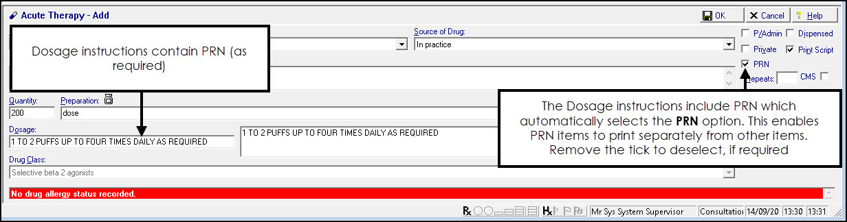 Adding a drug with an As Needed dosage instruction automatically selects a PRN option on Therapy Add, this can however, be deselected.