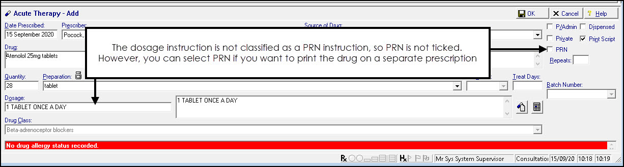 The option to select PRN is available for all drugs and not limited to drugs with 'As Needed' dosage instructions. Tick PRN to print medication on a separate prescription: