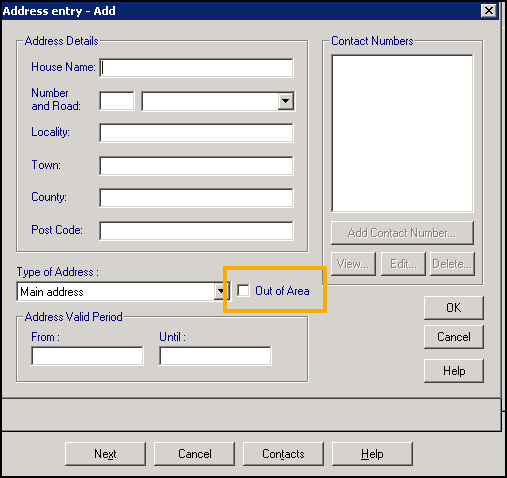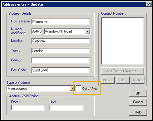 If you are happy to accept a patient from outside of your catchment area, during the registration process, from the Address entry - Add screen, tick Out of Area: