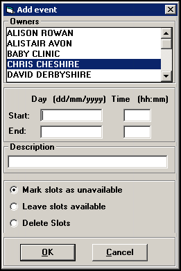 Delete Slots - Select to remove any slots in the time frame of the event.