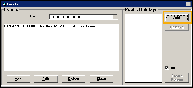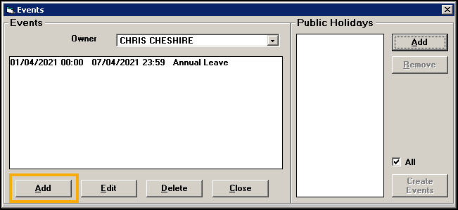 Annual leave, public holidays, study leave and other ad-hoc changes to your appointment books are referred to as Events.
