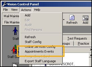 From the Vision 3 front screen, select Management Tools - Control Panel - File Maintenance - Actions - Appointments Events: