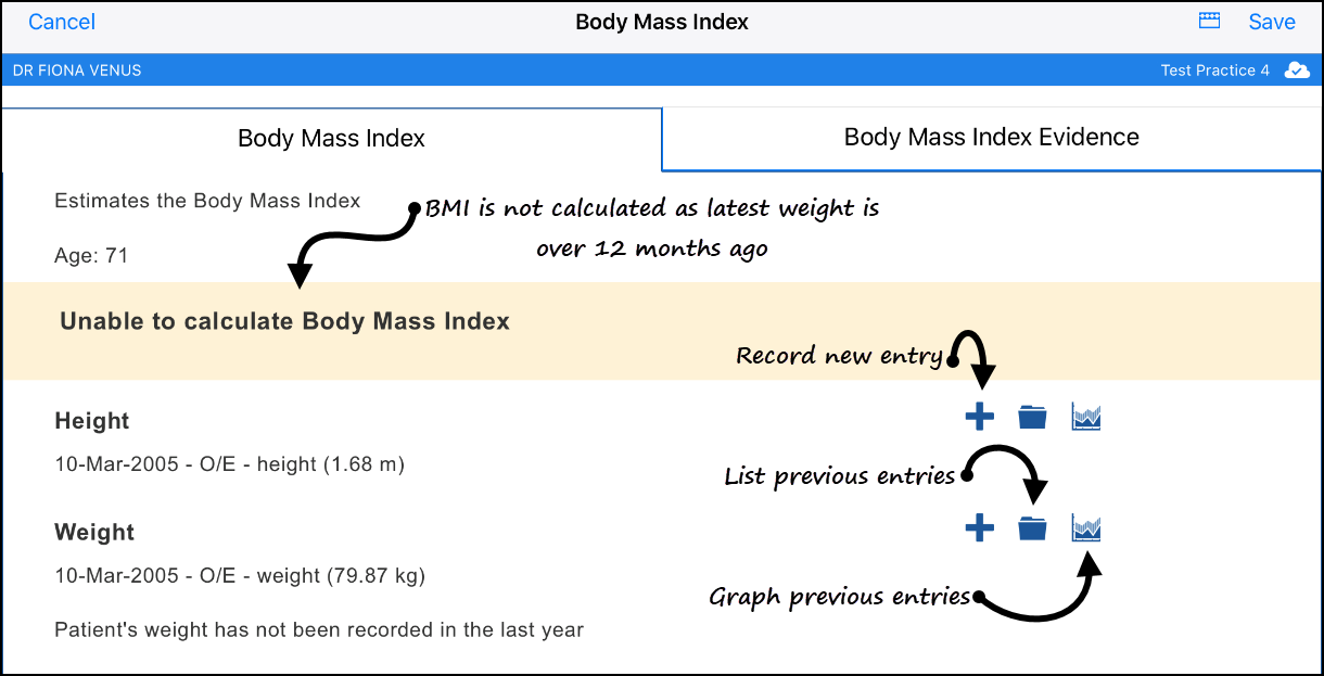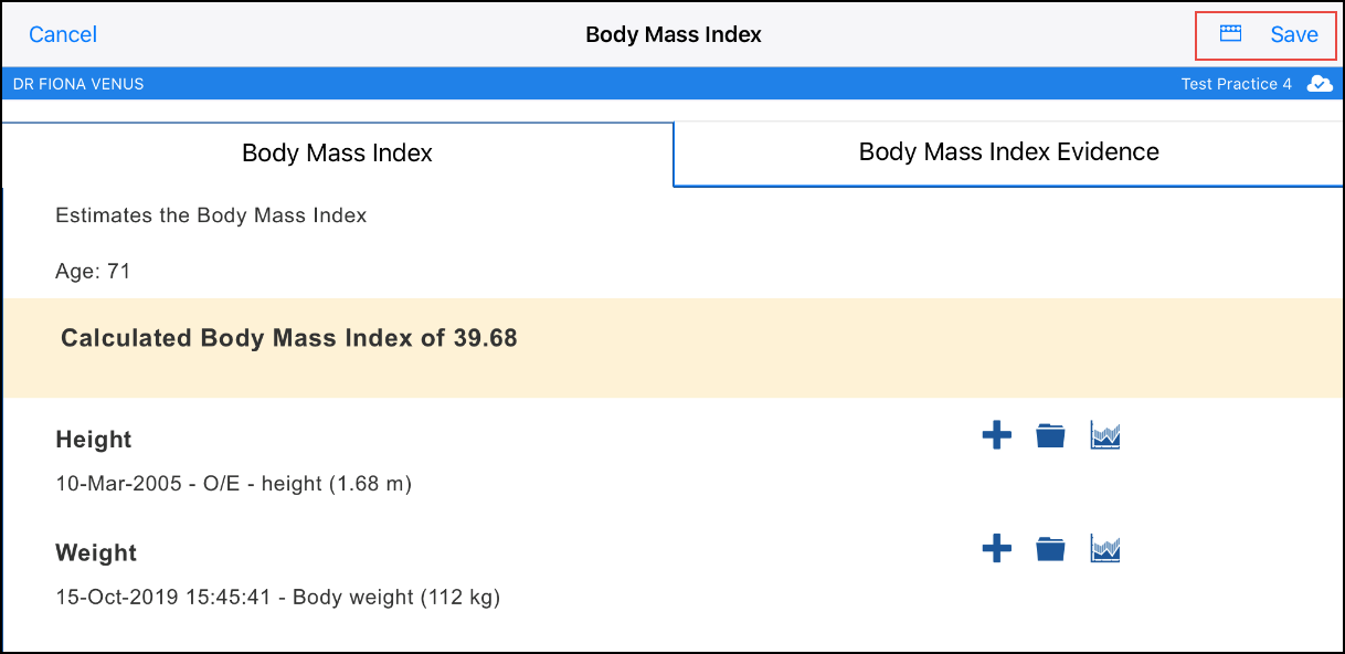 Once the Weight has been updated, the BMI displays automatically, select Save to update the patient's record.