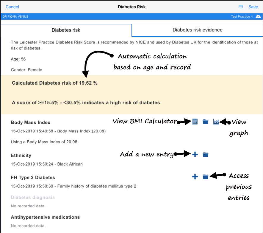 - To store the calculated Diabetes Risk into the patient's record, select Save.