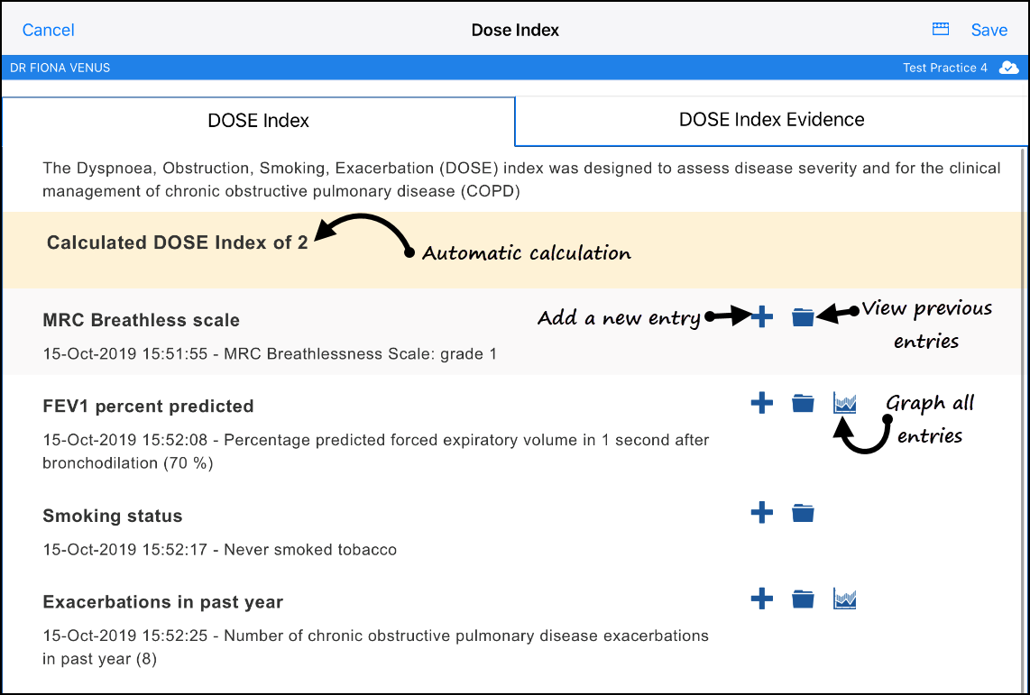- To save the calculated DOSE Index score to the patient record, select Save, or