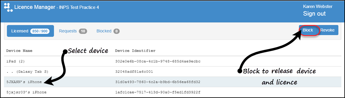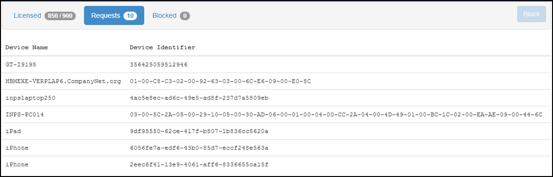 To block a device, select the required device and then select Block. It is removed from the list and the licence is released.