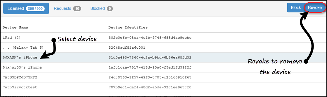 From this screen you can also Revoke a Licence and Block Devices from Registering.