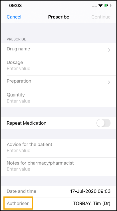 Medication - When recording a medication, the term Authoriser replaces Clinician: