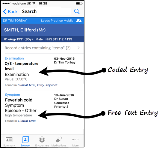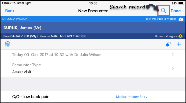 The search facility is now available when entering an encounter, allowing you to quickly search the patient's record for free text or coded entries.