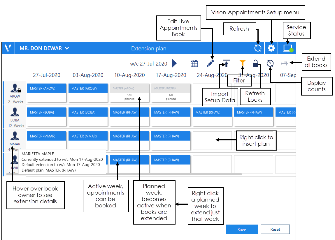 Appointments Setup initially opens displaying the Extension plan screen which gives an overview of the active books and lets you quickly access slot utilisation information.