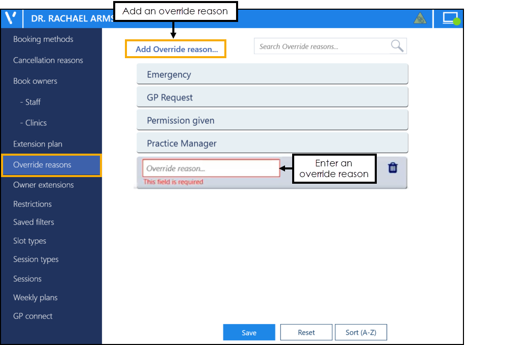 You can use Override reasons to record why you are booking an appointment in a slot with a Days/Hours Prior restriction.