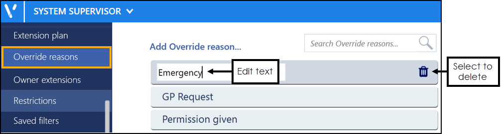 - Select the override reason you wish to edit or delete and then either: