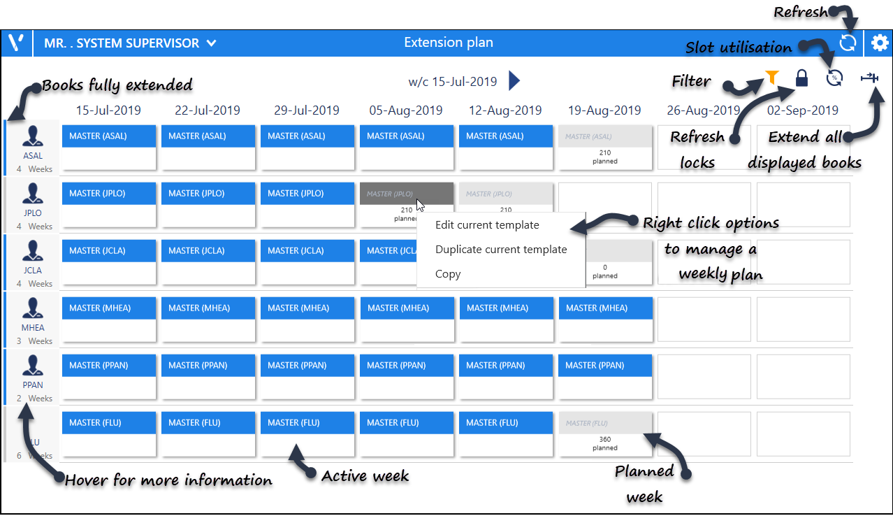 The Extension plan provides a snapshot of the appointment schedules, showing which weeks are active (blue), and how far in advance the books are extended.