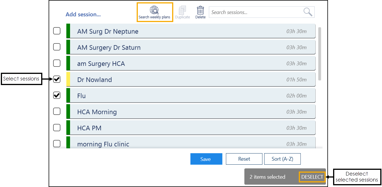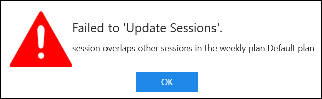 You can search for sessions in use in your weekly plans. This is useful if you are editing a session and need to find out which weekly plans it could affect. For example if you extend a session and it creates a conflict in the weekly plan, the following error displays:
