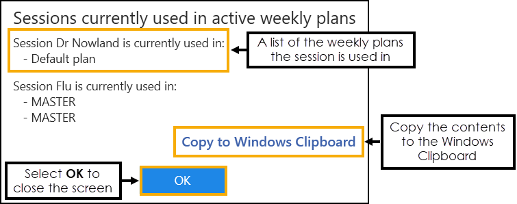 5. Click OK to close the Sessions currently used in active session weekly plans screen.