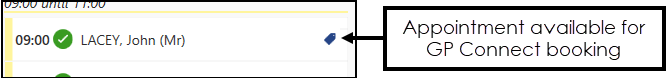 An appointment slot that is available for booking by a third party is highlighted by a GP Connect tag .
